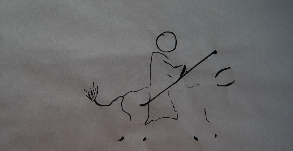 That this is a recursive process was really evident upon seeing my posts tagged as “art” on the Tricycle Editors’ Blog. It threw me into Stage 3 (Seeing the Ox), triggering all the concepts what “this means.” Twenty or thirty years ago, when I bought my brush for $1.96 + tax, the only intent was to take lessons to feed my love of all things Japanese (there’s a karmic link there that I will explore someday). As my teacher’s inept student, taming the grasping and wild mind definitely overlay the other stages of seeing the traces and actuality of how I could grow. At some point, I invested myself in the process (in first glimpse, did you notice the hat transforming into the horns of the ox). If I rode the ox home then, it was along paths that were tangled with thorny bushes which tore at my skin. I left the teacher but not the path – or the ox – and started the search again and again.