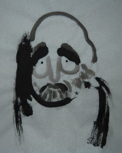 The beauty in Yuzen’s perception of practice is the softness he elicits from ink and paper.  Bodhidharma no longer needs to project the harsh unyielding authoritarian teacher (inner or outer) but rather can sit in an empathetic space.  The upturn of the inner brows, the open gaze, and cartoon nose invite us to pour our struggles out to him.