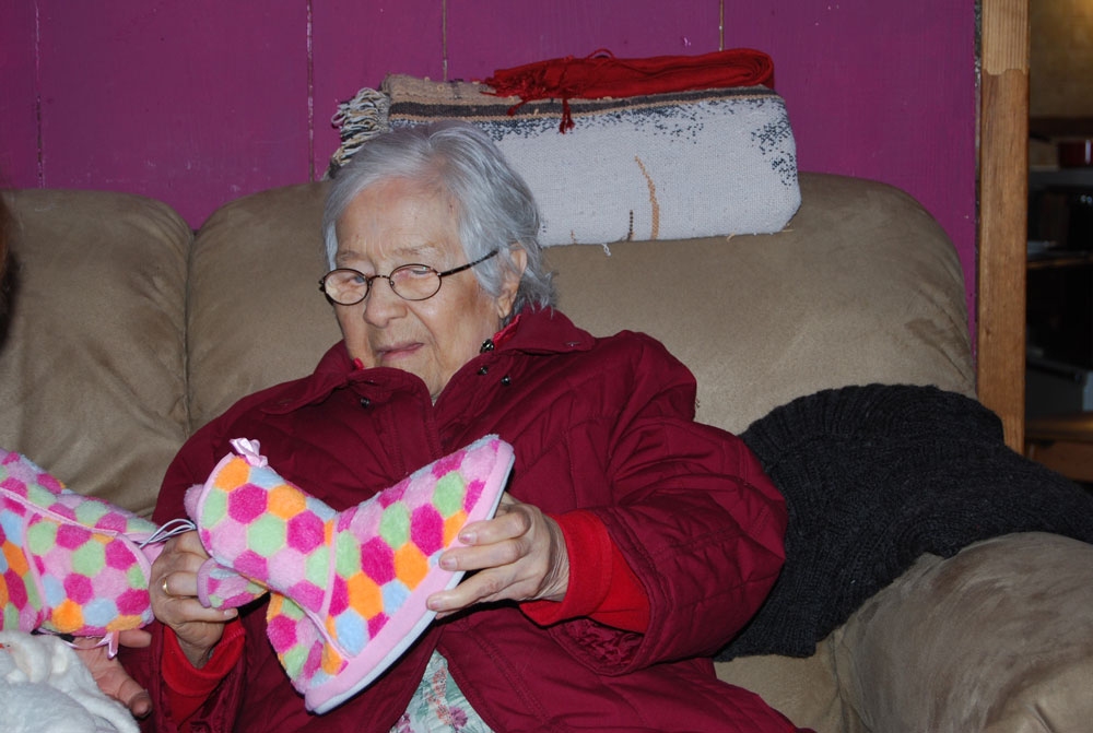 This is Mom. I just missed a shot of her trying on the slippers as mitts. Unlimited by form, a true practitioner. Dementia does that, I suppose. Cleaves off the complicated parts of our mind and leaves the barest minimum. Although I would wish that some of the necessary pieces were still intact – like certain memories. But then, maybe that’s not really necessary either: