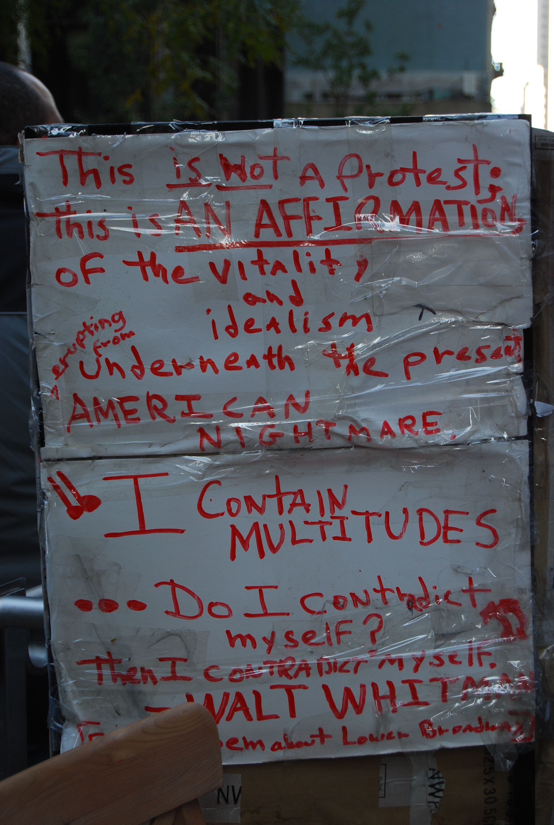 So standing there on the edge of OWS taking pictures, I felt like a sleazy tourist and probably took on a 100% defensive posture.  I tried to strike up a conversation with two men who had a terrific sign but my request for permission to photograph the sign earned me a dismissive grunt – sleazy tourist.  For a moment, I thought of walking away, going around the corner where the unemployed grandmother sat knitting mitts and scarves for the residents of OWS, where the gas-masked, person-pillar draped in black performed eschatological street art, down towards the drumming that called out to all the hearts that beat.  But I didn’t.  I took the picture and thanked them.
