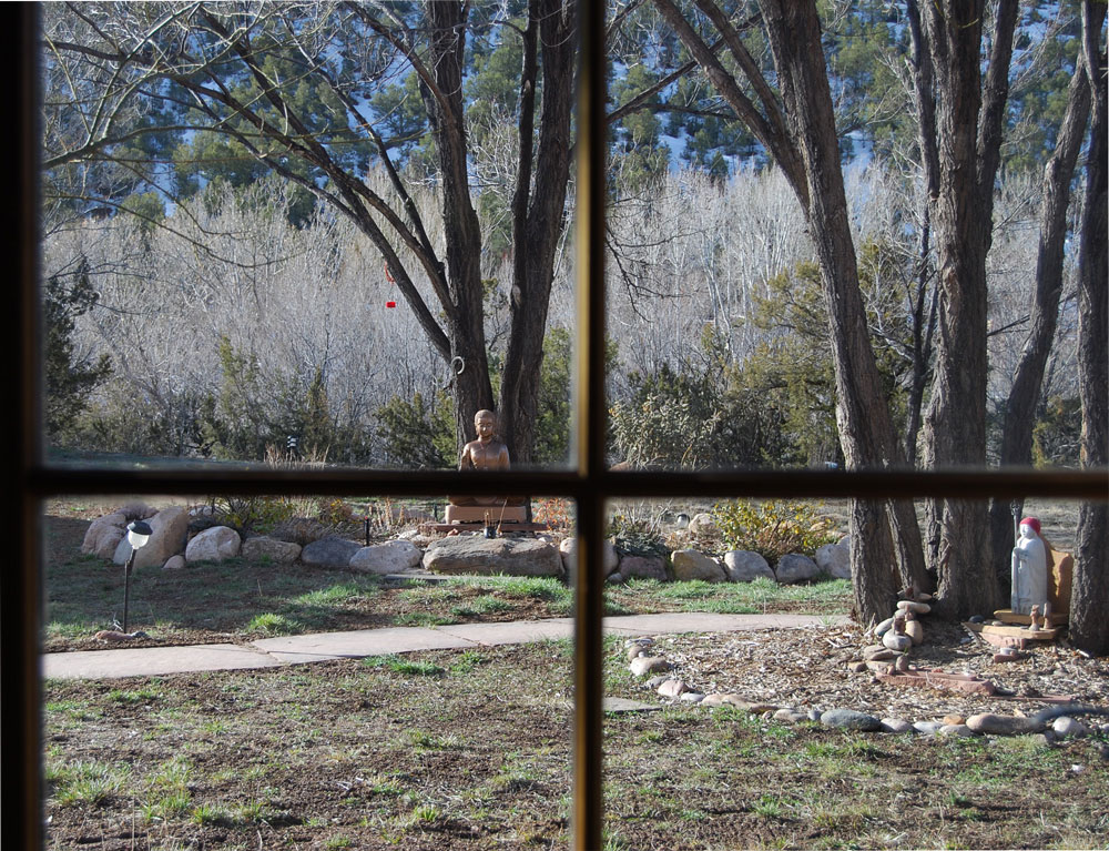 The view out onto the Upaya grounds reminds me of the divisions I create between stillness and activity: sitting Buddha and Jizo in counterpoint.
